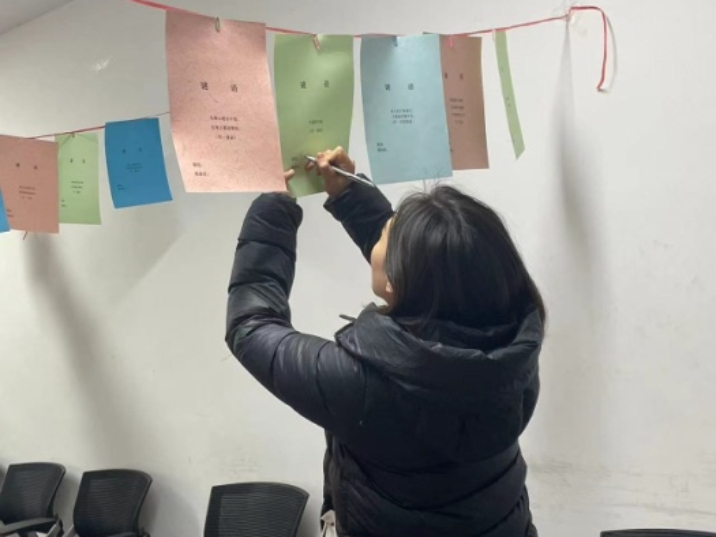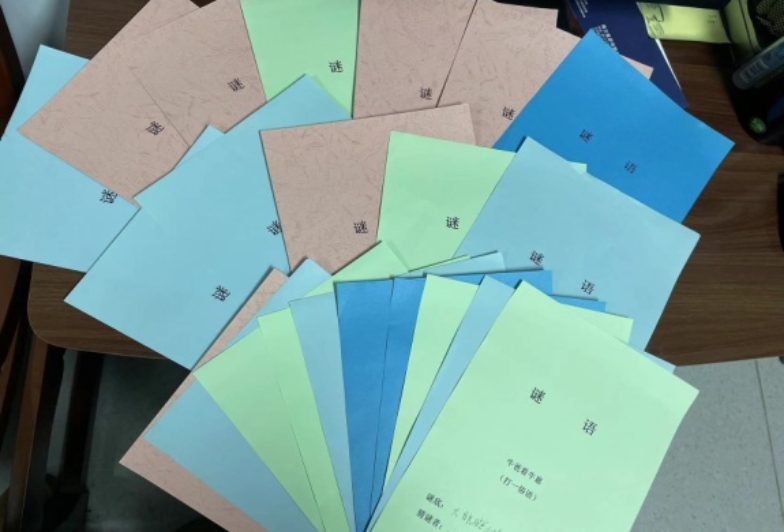 三十余张字谜悬挂,活动一开始,便吸引了很多教职工驻足参与。谜面有俗语、有地名、有生活用品、就连历史人物都不落下,科学而通俗,生动而活泼,面广而量大。在益智添趣、娱乐生活的同时,更以这种传统的文艺形式展现了一方水土历史、自然、人文、民俗的特色魅力。这个过程中,大家乐中有学,共同领略祖国语言的奥妙。五彩的谜语如条条丝带,老师们穿梭其中,流连忘返,构成一道独特的风景画,谜面前,一双双欣喜而激动的眼睛闪烁着智慧的光芒。或独自沉思,或交头讨论,不时传来欢声笑语,共同体验着猜谜带来的乐趣,处处洋溢着浓浓的文化气息。