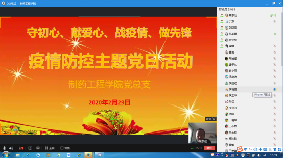 2020年2月29日上午,制药工程学院党总支以QQ群视频会议的形式召开支部专题学习,按照上级有关精神,结合学院实际情况,开展“守初心、献爱心、战疫情、做先锋”线上主题党日活动。会议由制药工程学院院长、总支书记韩恩远同志主持。