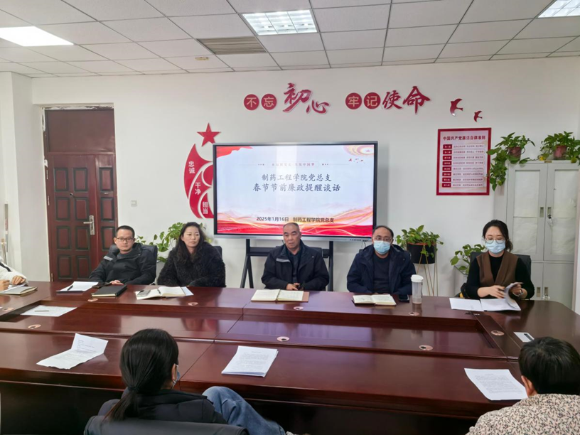 为深入学习贯彻党的二十大、党的二十届三中全会精神,持续推动党的纪律学习教育走深走实,拧紧“思想关”、守好“廉洁心”、绷紧“作风弦”,2025年1月16日,制药工程学院党总支在301党员活动室开展“知敬畏存戒律守底线,廉洁从业守初心”主题党日暨春节前廉洁教育集中谈话活动,活动由党总支书记窦传斌主持,学院全体党员参加。