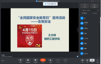 在第5个全民国家安全教育日来临之际,制药工程学院为增强学院师生的安全防范意识与知识,推进国家安全教育工作深入开展,增强责任感与应急判断力,于2020年4月14日下午,利用钉钉网络召开宣讲会,由王文辉老师为全院教师普及生物安全知识。在第5个全民国家安全教育日来临之际,制药工程学院为增强学院师生的安全防范意识与知识,推进国家安全教育工作深入开展,增强责任感与应急判断力,于2020年4月14日下午,利用钉钉网络召开宣讲会,由王文辉老师为全院教师普及生物安全知识。