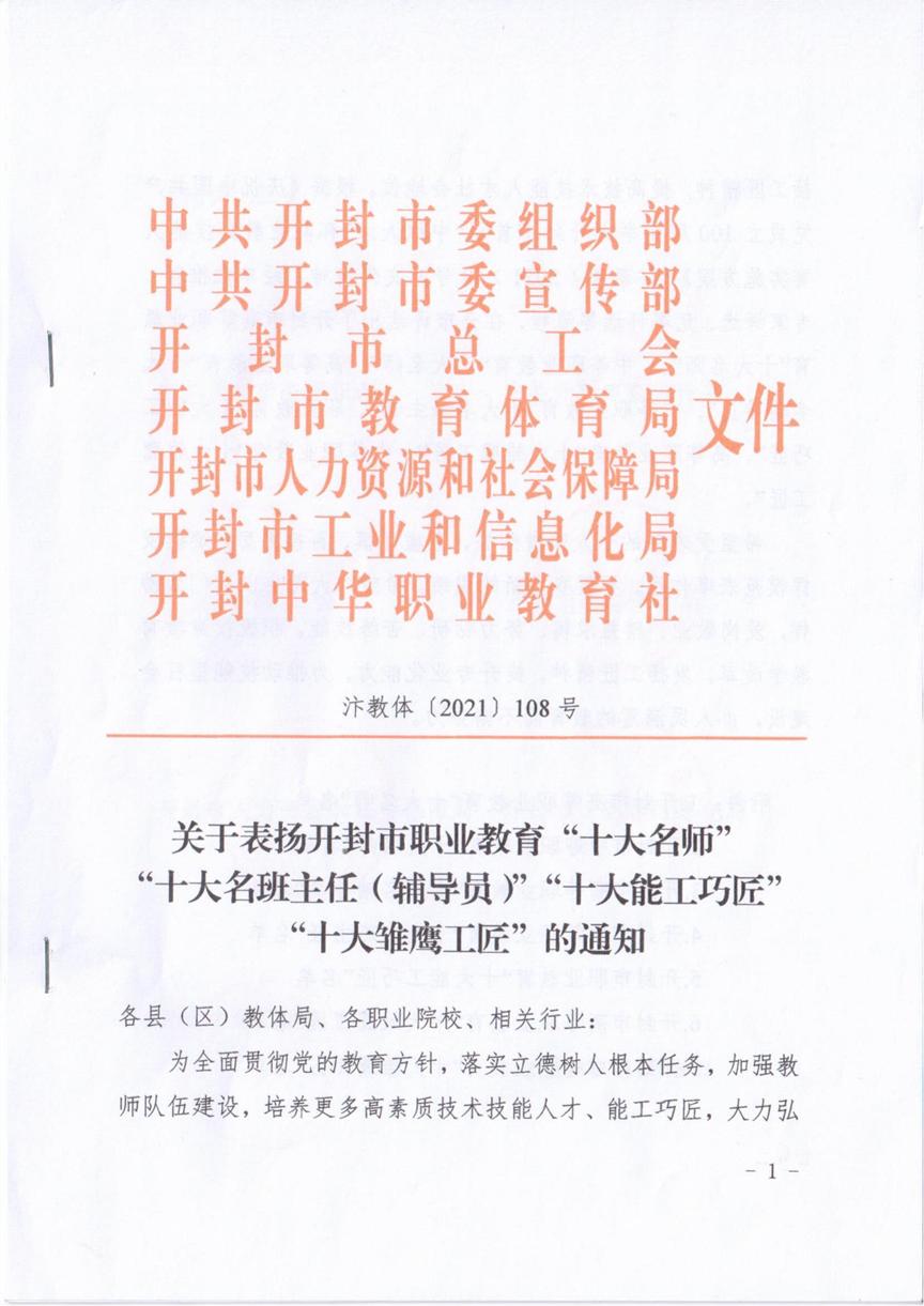 2021年12月16日,由中共开封市委组织部主办、开封市教育体育局承办的首届“中原人才”杯职业教育技能大赛颁奖仪式在汴梁小宋城举行,我校制药工程学院朱玉玲老师经过层层选拔和严格考核,被评为开封市高等职业教育“十大名师”荣誉称号。
