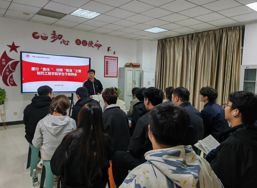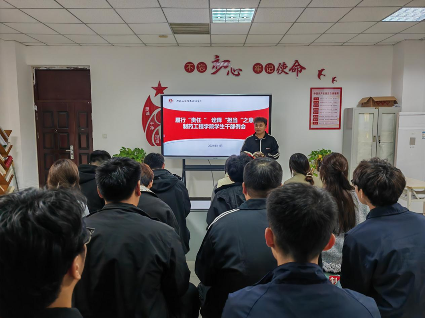 为进一步提升学生会干部的自我管理、自我服务意识,提高工作能力和服务水平,以及接下来工作事物的安排。制药工程学院学生会于2024年11月14日在行政楼301召开学生干部例会,学生会主席团及各部部长参加本次会议,会议由主席团成员祝海辰主持。