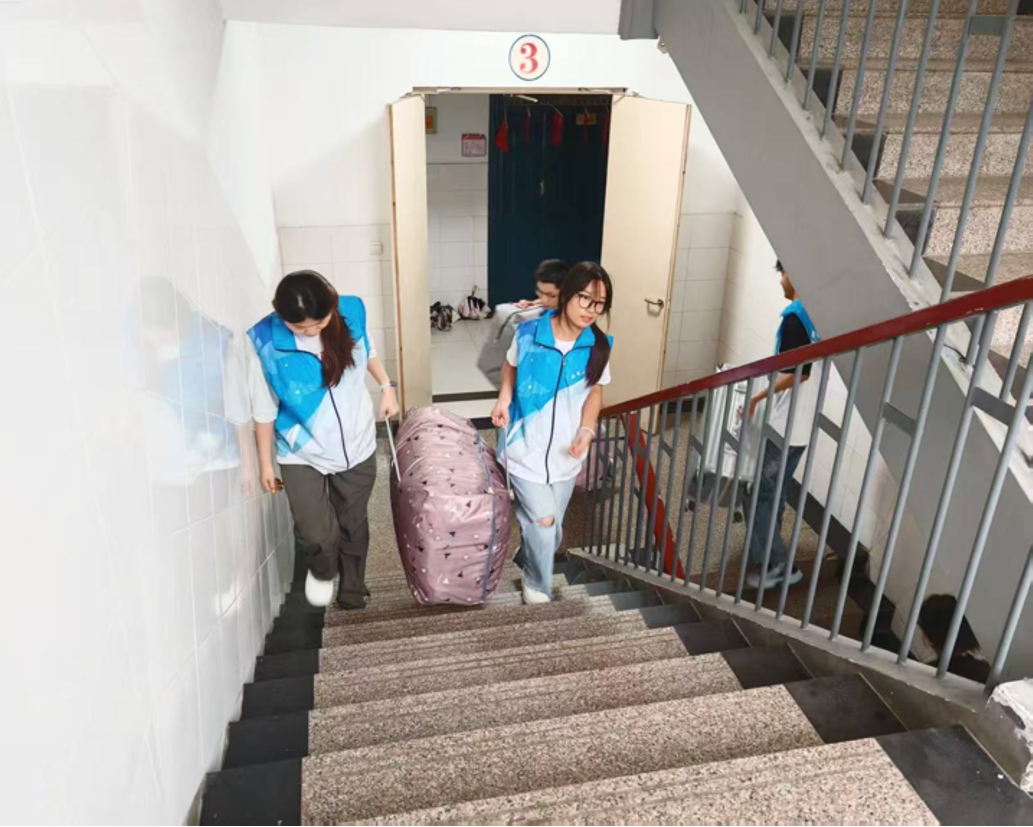从清晨到日暮,校园各处都活跃着志愿者们忙碌的身影——从校门引导、入学信息登记,到协助新生搬运行李、送达宿舍楼,他们的足迹串联起新生入学的关键环节。在登记处,志愿者们耐心指导新生填写资料、办理手续,细致解答关于校园生活、课程安排的各类疑问;在宿舍楼前,他们主动接过新生手中的行李,一边帮忙搬运,一边热情介绍宿舍周边环境,用行动全力保障每一位新生顺利入住。