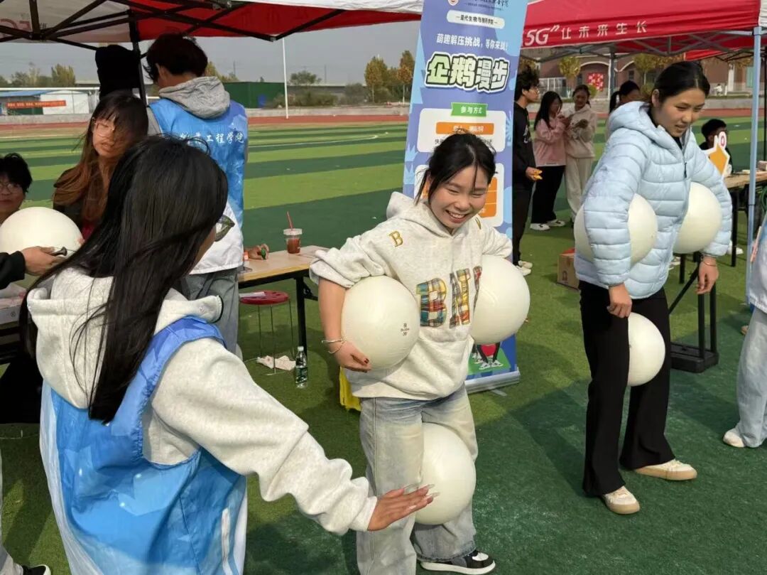活动前,志愿者们提前备好瑜伽球等道具,向到场学生清晰讲解“企鹅漫步”的游戏规则。现场氛围热烈融洽,同学们热情高涨。大家模仿企鹅摇摆前行,既要专注把控身体平衡,又要奋力冲刺完成赛程,在奔跑与协作中尽情释放学业压力,欢声笑语不断。单人挑战时的全神贯注、团队接力时的默契配合与相互鼓励,充分展现了学子们积极向上、团结协作的精神风貌。