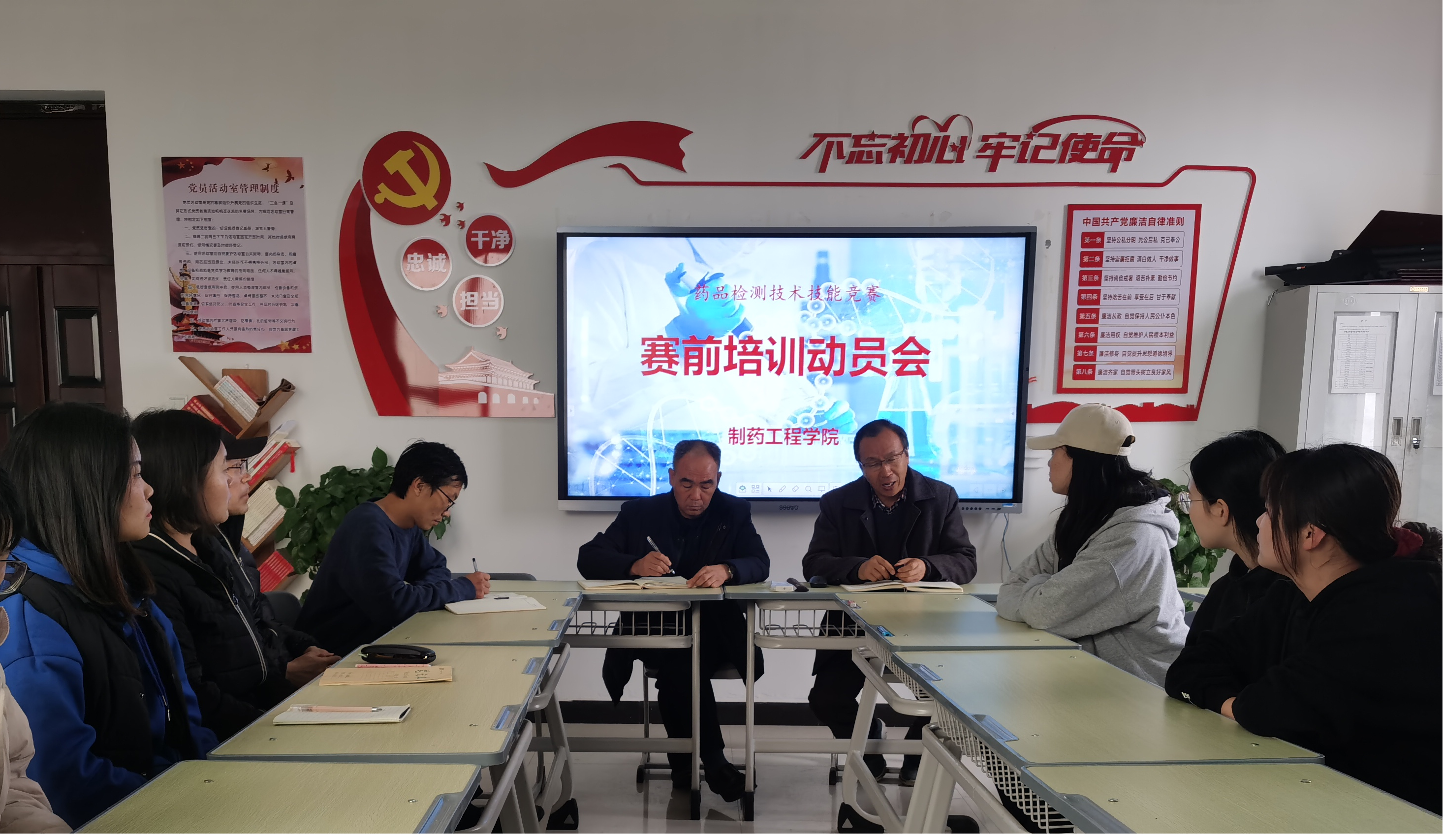为培养大批药品检测类工匠人才,做好2021年药品检测技术技能竞赛赛前准备工作,制药工程学院于2021年3月12日下午在501党员活动室召开赛前动员会,韩恩远院长,窦传斌书记,指导教师龚子东及院办责任老师和16名备赛人员参加此次会议。
