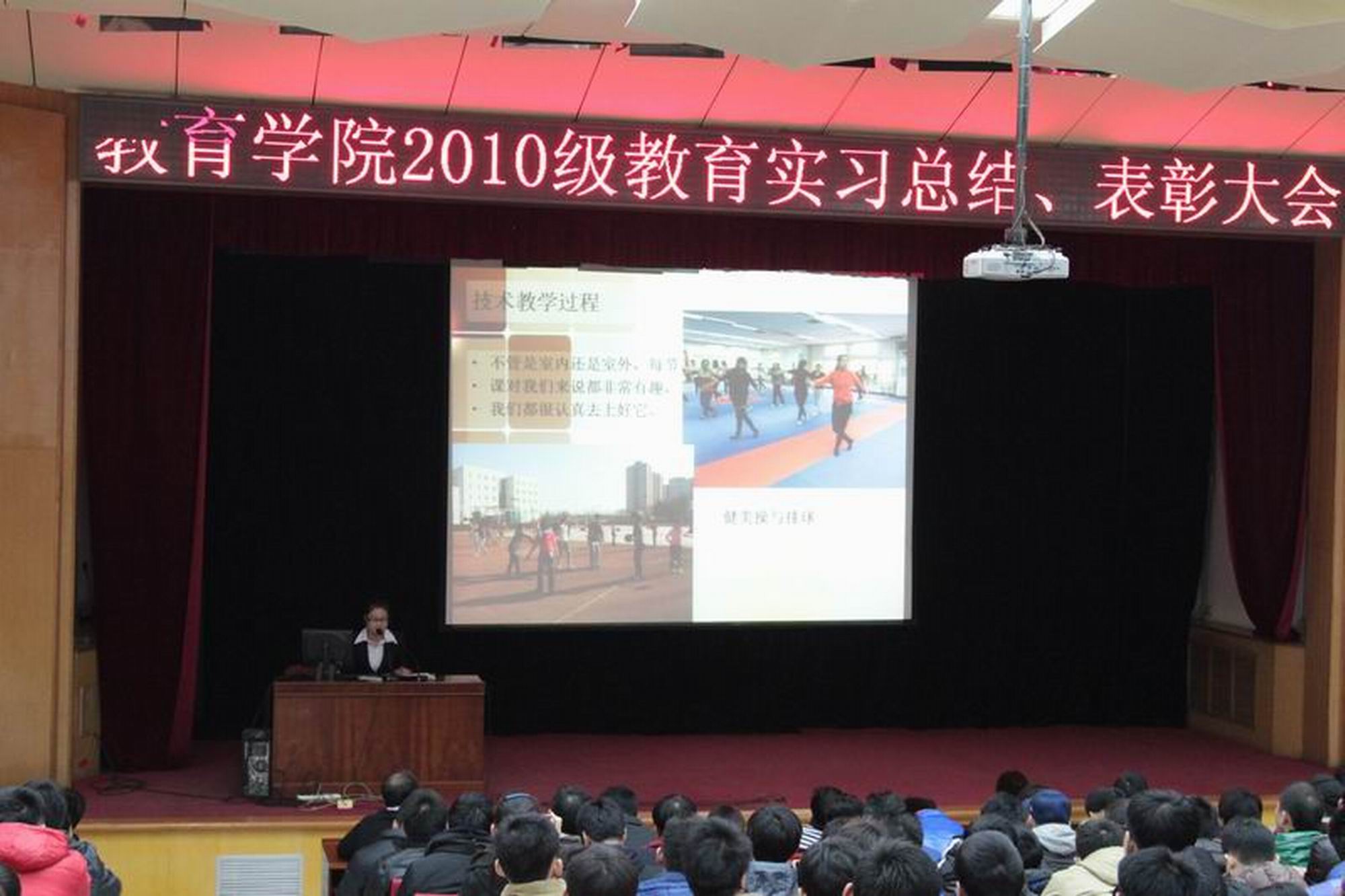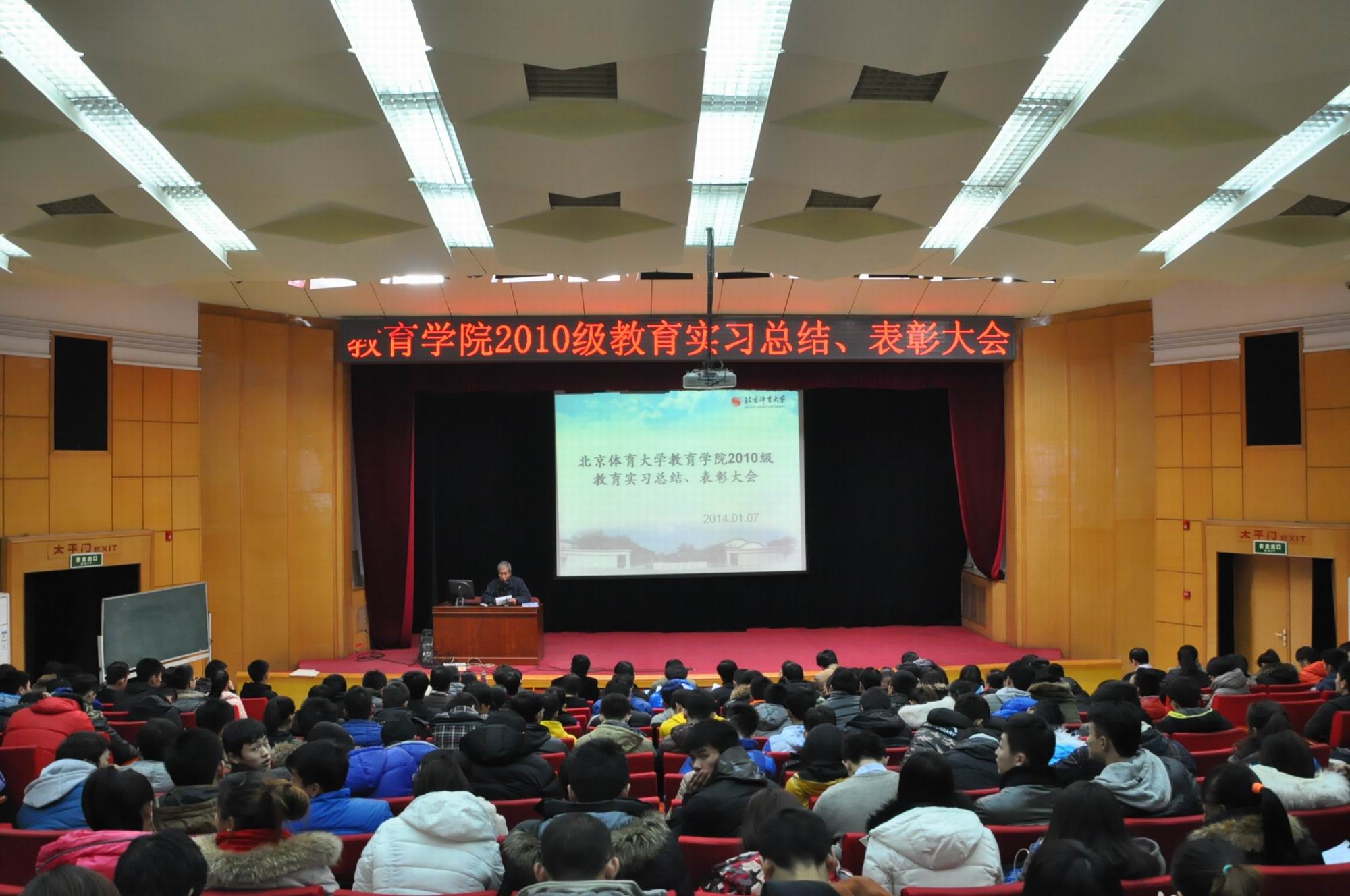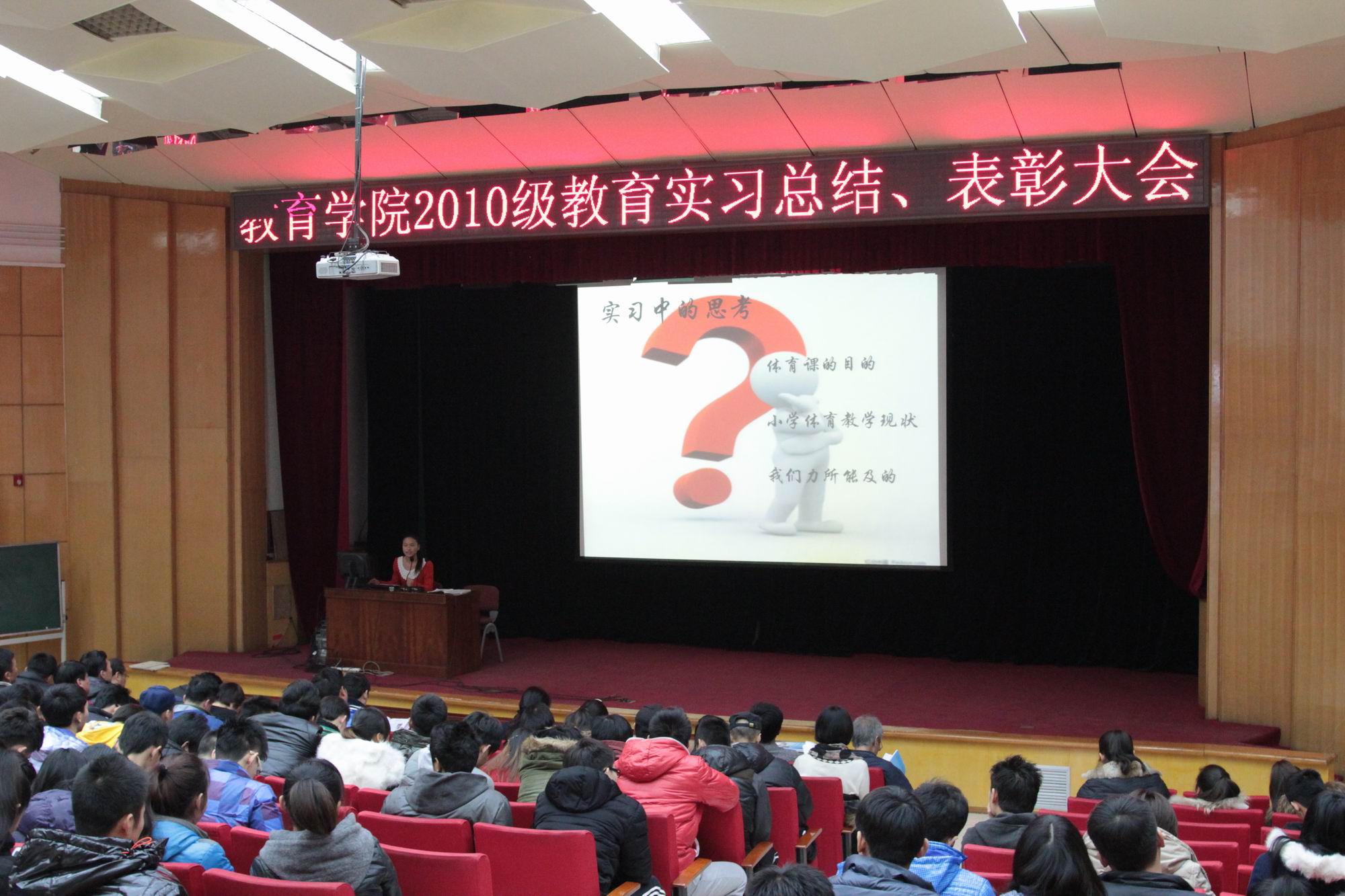2014年1月7日上午9点,开云kaiyun官网2010级在大学生活动中心召开了教育实习总结暨表彰大会。大会由武文强副院长主持,参加会议的有刘大庆副校长,教务处章朝晖副处长,开云kaiyun官网的王华倬院长、聂伟书记和尚迎秋副书记,学校各带队指导老师、实习基地23位指导老师以及2010级与2011级的同学。