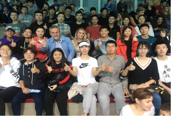 在今天的比赛中,同学们不仅见证了到了顶级的水球队伍的精彩表现,还见到了萨格勒布市市长以及奥运会水球队伍的体能教练。在比赛中场休息时间,市长班迪奇先生来到看台与北体师生交流并合影。