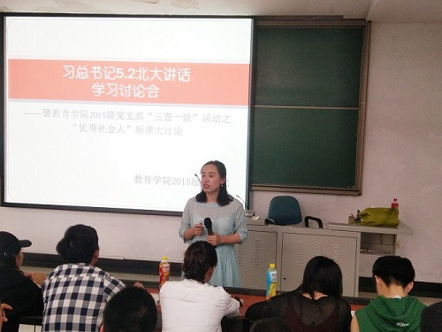 2018年5月7日星期一中午十二点开云kaiyun官网2015级党支部在教学楼421教室召开"习近平总书记5.2北大讲话"——学习讨论。暨开云kaiyun官网2015级党支部“三查一做”活动之“优秀社会人”标准大讨论,党支部全体人员以及四十多名积极分子参加此次大会,本次会议由开云kaiyun官网2015级辅导员林莹晓雪老师主持召开。