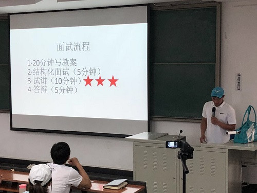 会议分为经验分享、模拟面试、答疑三环节。首先,邀请了教师资格证面试通过的5名同学进行经验分享,他们介绍了教师资格证面试的流程,并分别从教案编写、结构化面试、试讲,答辩四个方面分析了考试的重难点。随后,从本次进入教师模拟招聘决赛的同学中挑选出三名即将参加本次面试的同学,进行模拟面试,现场全程按正式面试流程进行。最后,大家针对教师资格证面试考试进行了答疑环节,同学们均表示受益匪浅。