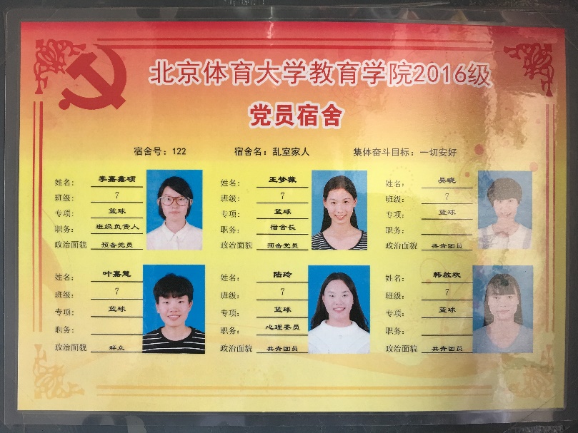 在强化学风活动期间,2015级开展“党员示范宿舍”创建活动,其中北一楼216女生宿舍和南五楼110男生宿舍是最具有引领作用。他们14位学生既点燃了自己,又照亮了他人。216的姑娘们凭借着自己的努力,获得了“优秀奖学金”、“三好学生”、“优秀共青团员”、“优秀年级干部”“优秀实习生”等多项荣誉,并且全部成功考取了教师资格证、普通话证书以及多类项目裁判证书。学校和学院广泛宣传她们的党员先锋事迹,创造了良好的学习育人氛围。